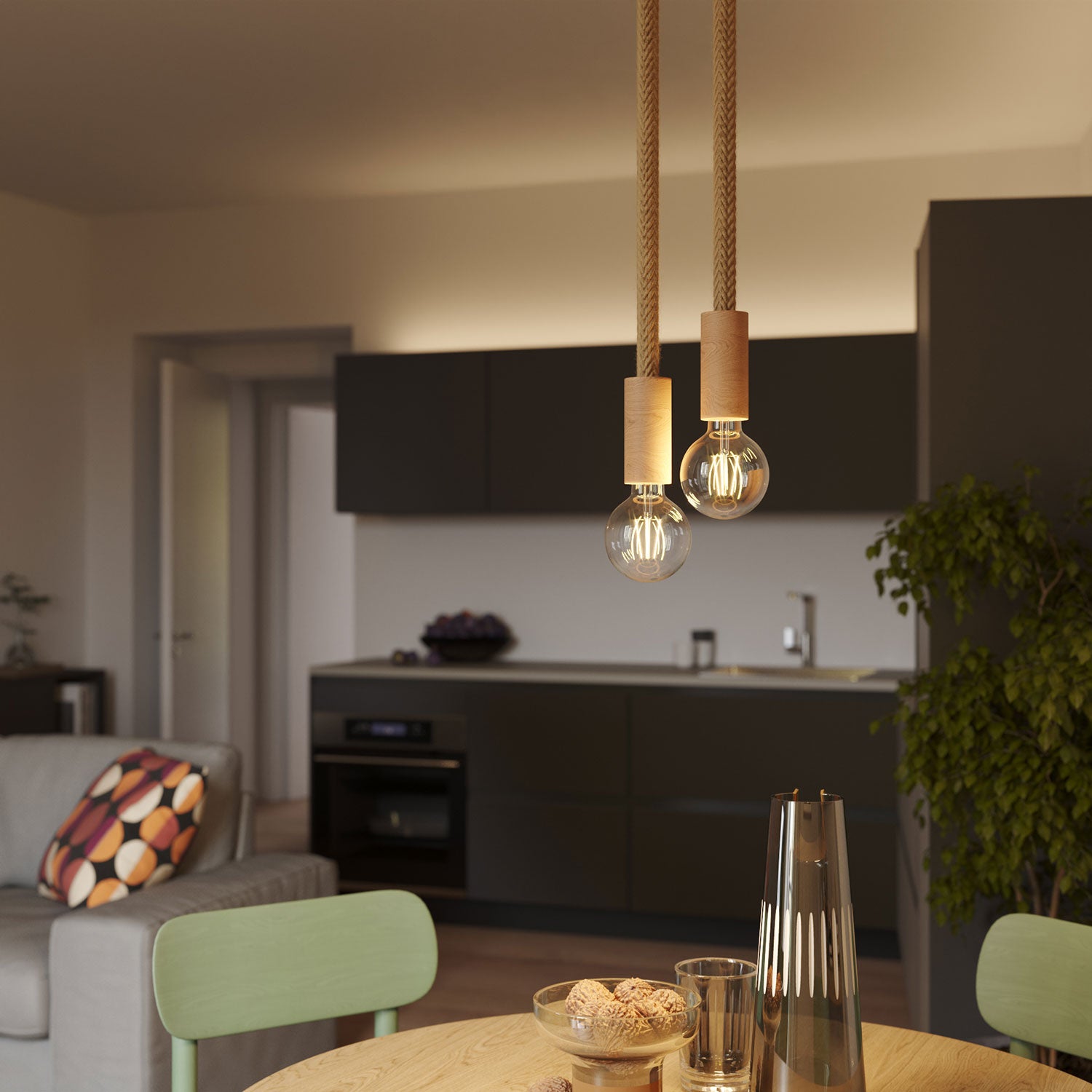 Viacnásobné závesné svietidlo s 2 padaniami, komplet s povrazom 2XL a drevenými detailmi - Neutrálne
