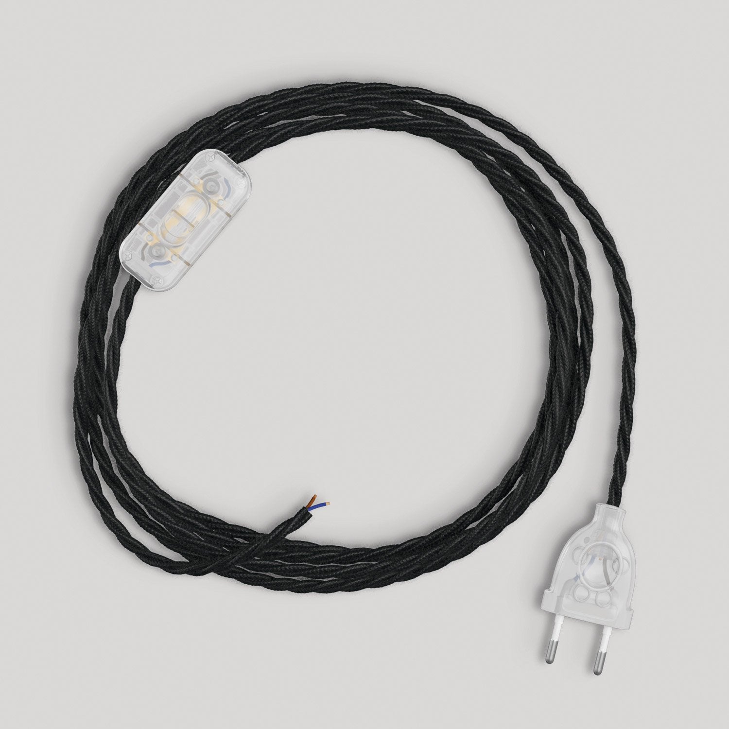 Prispôsobte si svoju kabeláž výberom farby zástrčky a vypínača: biela pre jemný kontrast, čierna ideálna pre úplne čierny vzhľad a priehľadná na zvýraznenie štruktúry kábla.