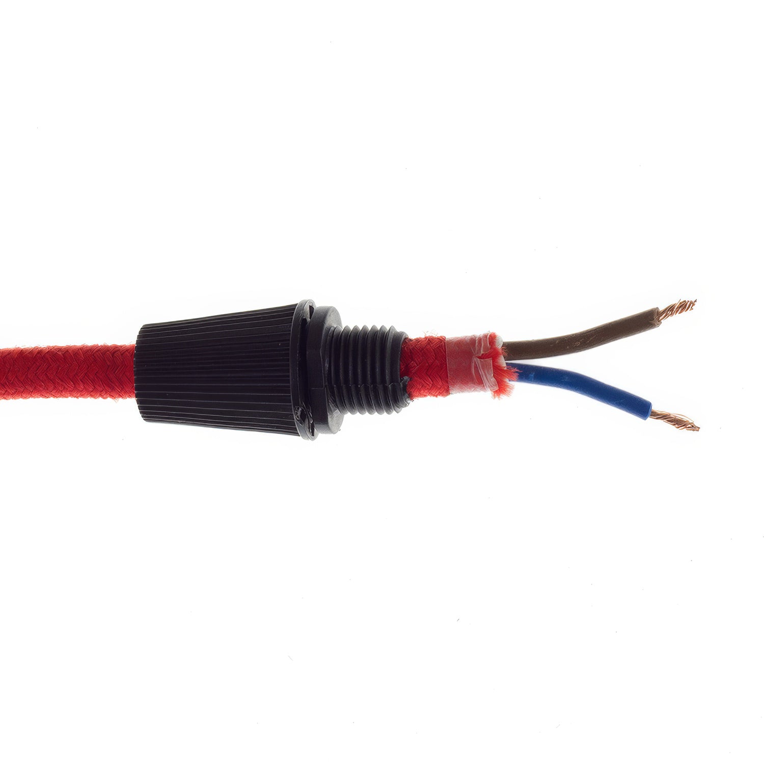 Káblová svorka v čiernej úprave na pevné uchytenie elektrických káblov z textilu k objímkam a stropným rozetám akéhokoľvek typu a materiálu.