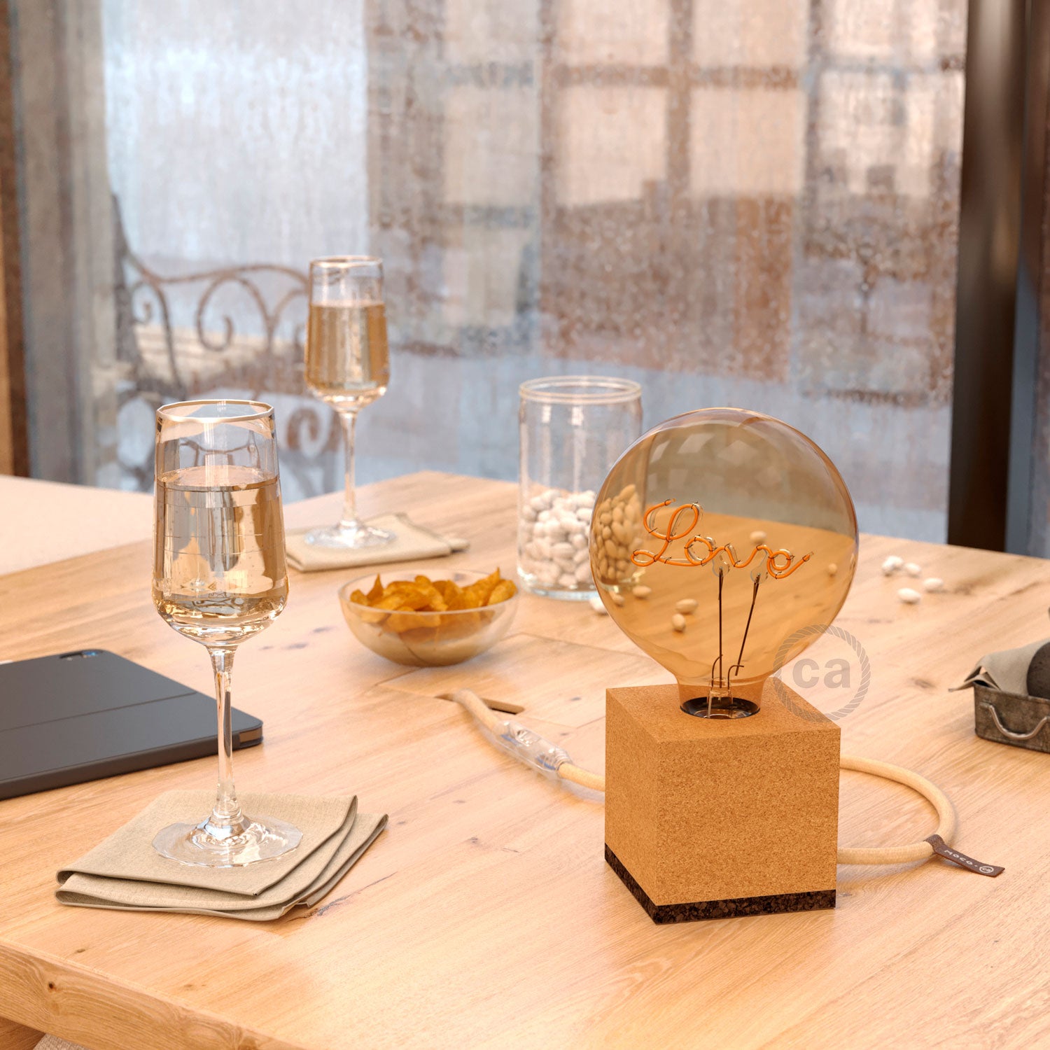 Navrhnutá priemyselnou dizajnérkou Irenou Übler, Cubetto je exkluzívna stolová lampa zložená zo svetlého korkového kocka položeného na tenkej vrstve tmavého korku, vybavená textilným káblom dostupným v rôznych farbách, priehľadným vypínačom a zástrčkou.