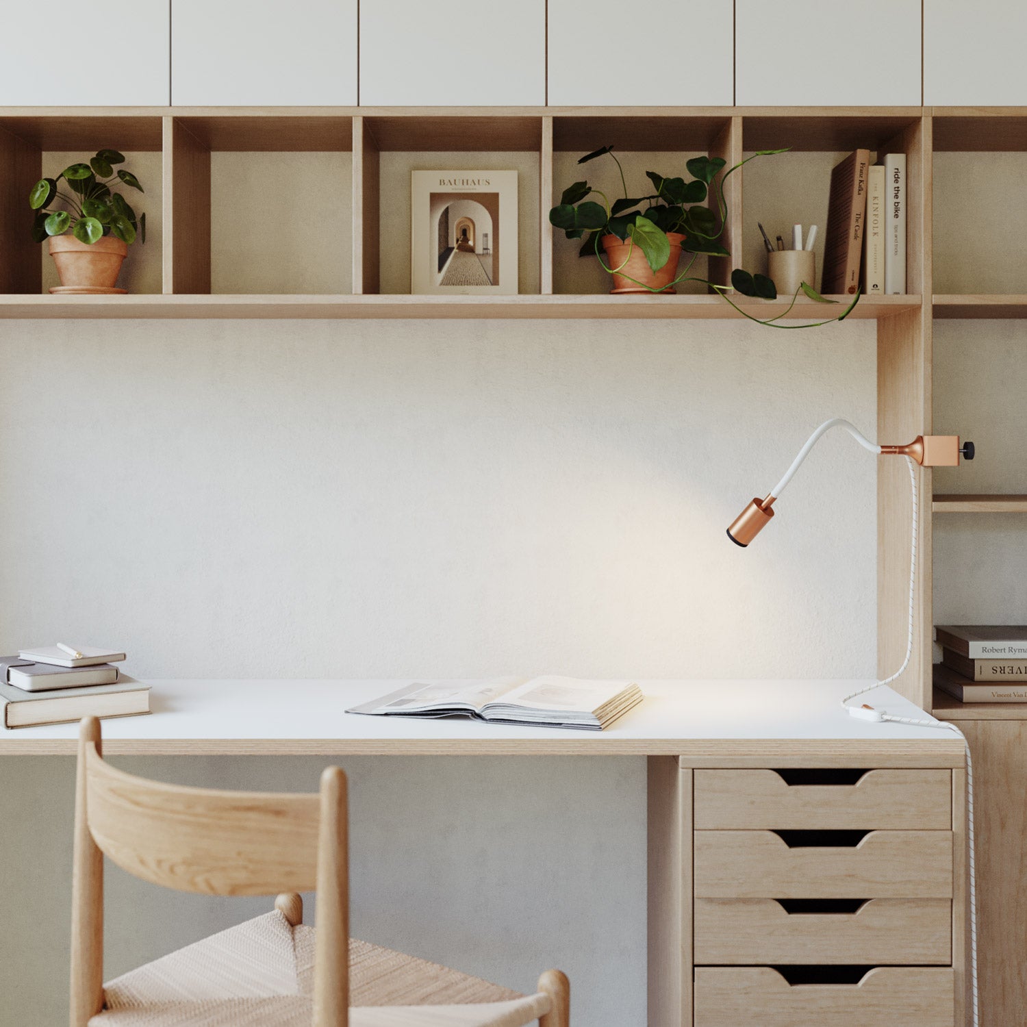 Vhodná na písacie stoly, police, nočné stolíky alebo študijné kúty, saténová medená svorka premení akýkoľvek povrch na elegantnú a funkčnú základňu pre vašu lampu.