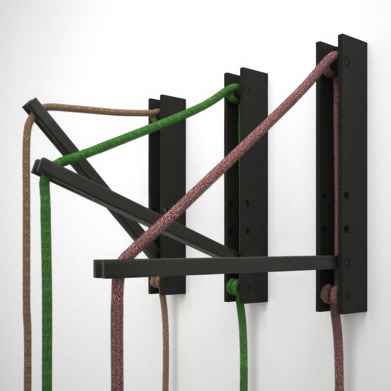 Vďaka svojmu dizajnu nie je potrebné viesť káble cez otvory: jednoducho sa ovinú okolo drážkovaných drevených podpier. Rameno, pohyblivé a nastaviteľné v troch rôznych výškach, vám umožní dosiahnuť stále nové estetické konfigurácie.