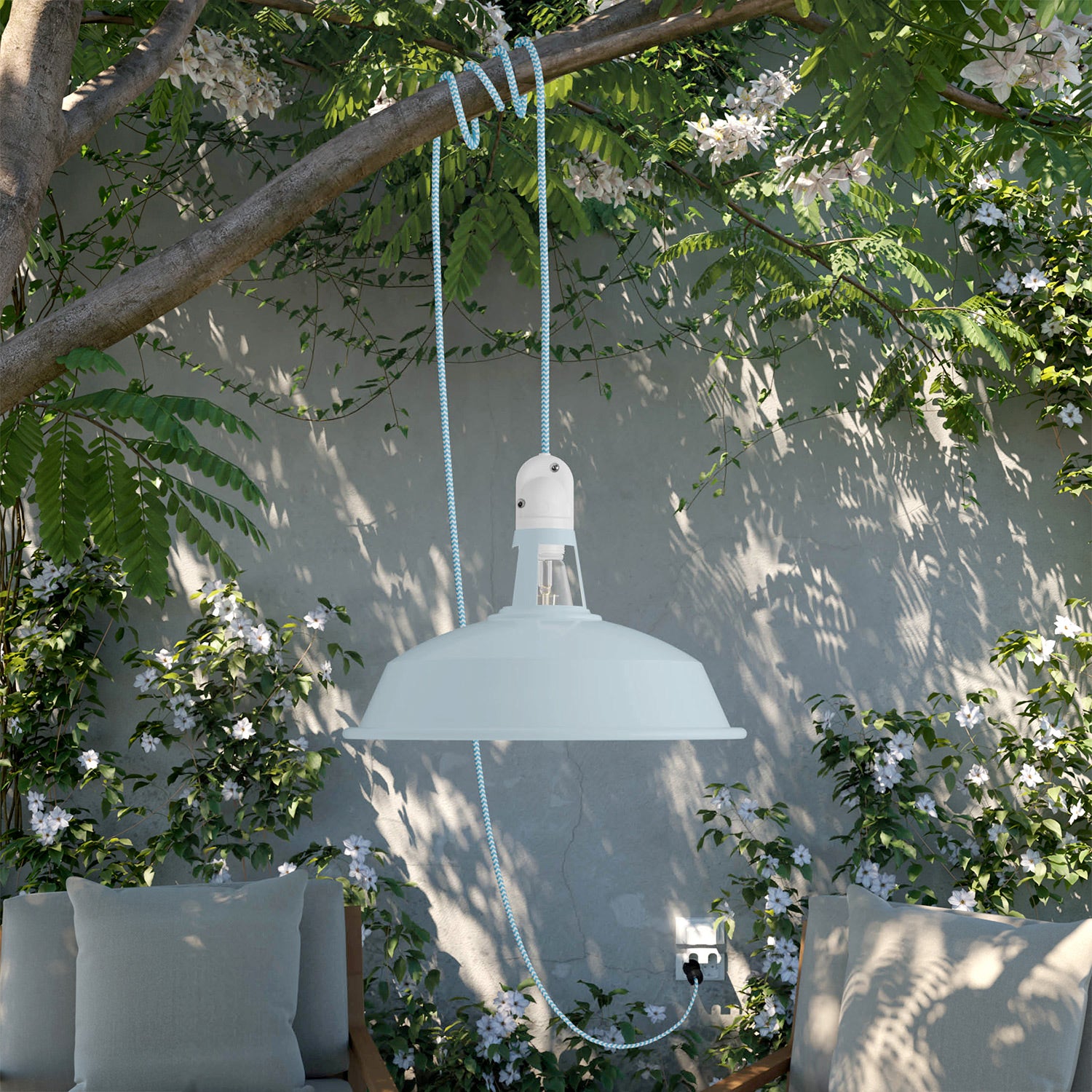Prenosná vonkajšia lampa Snake s tienidlom Harbour, 5 m textilný kábel, objímka IP65 vodotesná - Modrá "papier na cukor"