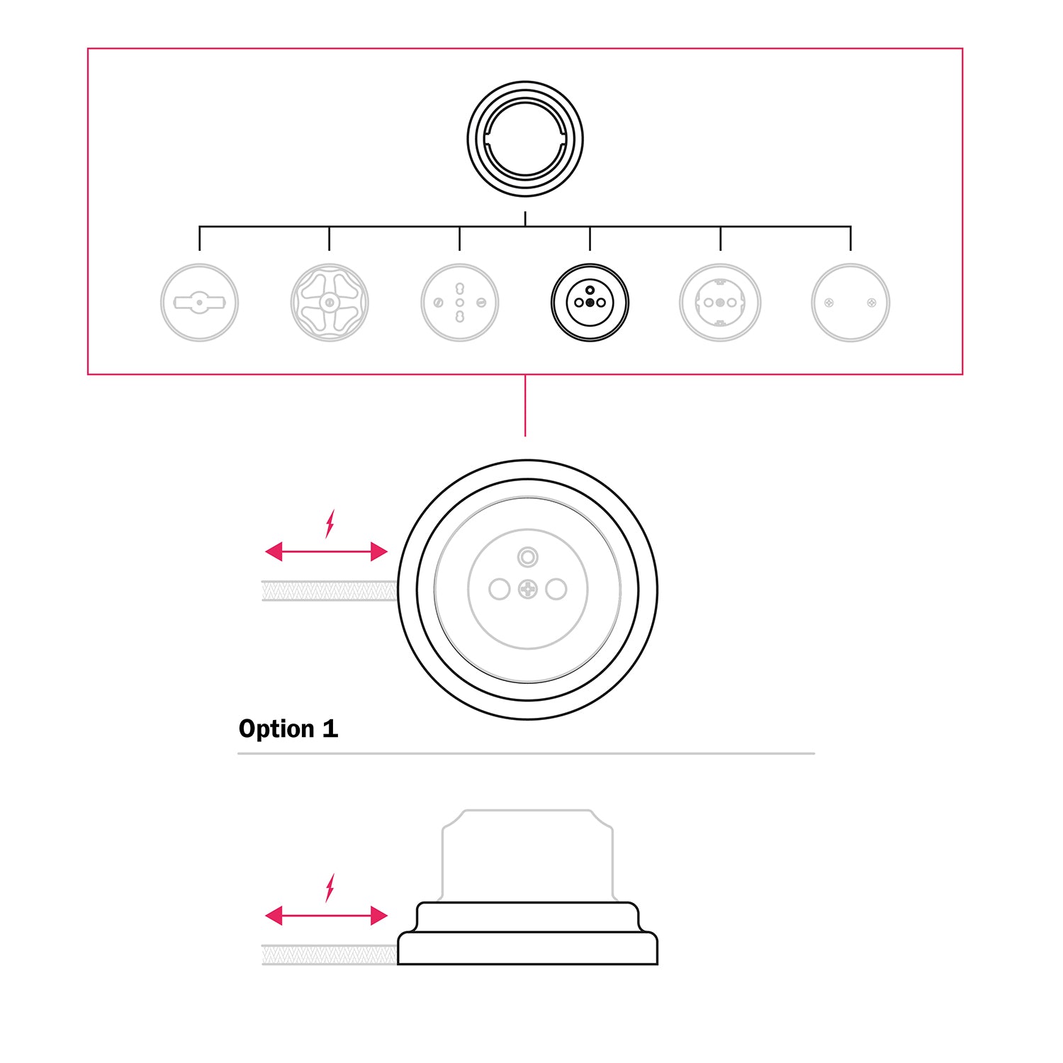 Sada sa skladá z dvoch prvkov: francúzska porcelánová zásuvka v bielej farbe, ideálna pre tých, ktorí chcú mať viditeľnú elektroinštaláciu so svetlým a univerzálnym vzhľadom, a základňa navrhnutá na pripojenie aj elektrických káblov s väčším prierezom. Vďaka systému vstupu/výstupu umožňuje ľahké pripojenie viacerých svetelných bodov alebo iných produktov z rovnakej línie, čím zaisťuje praktickosť a estetickú kontinuitu.