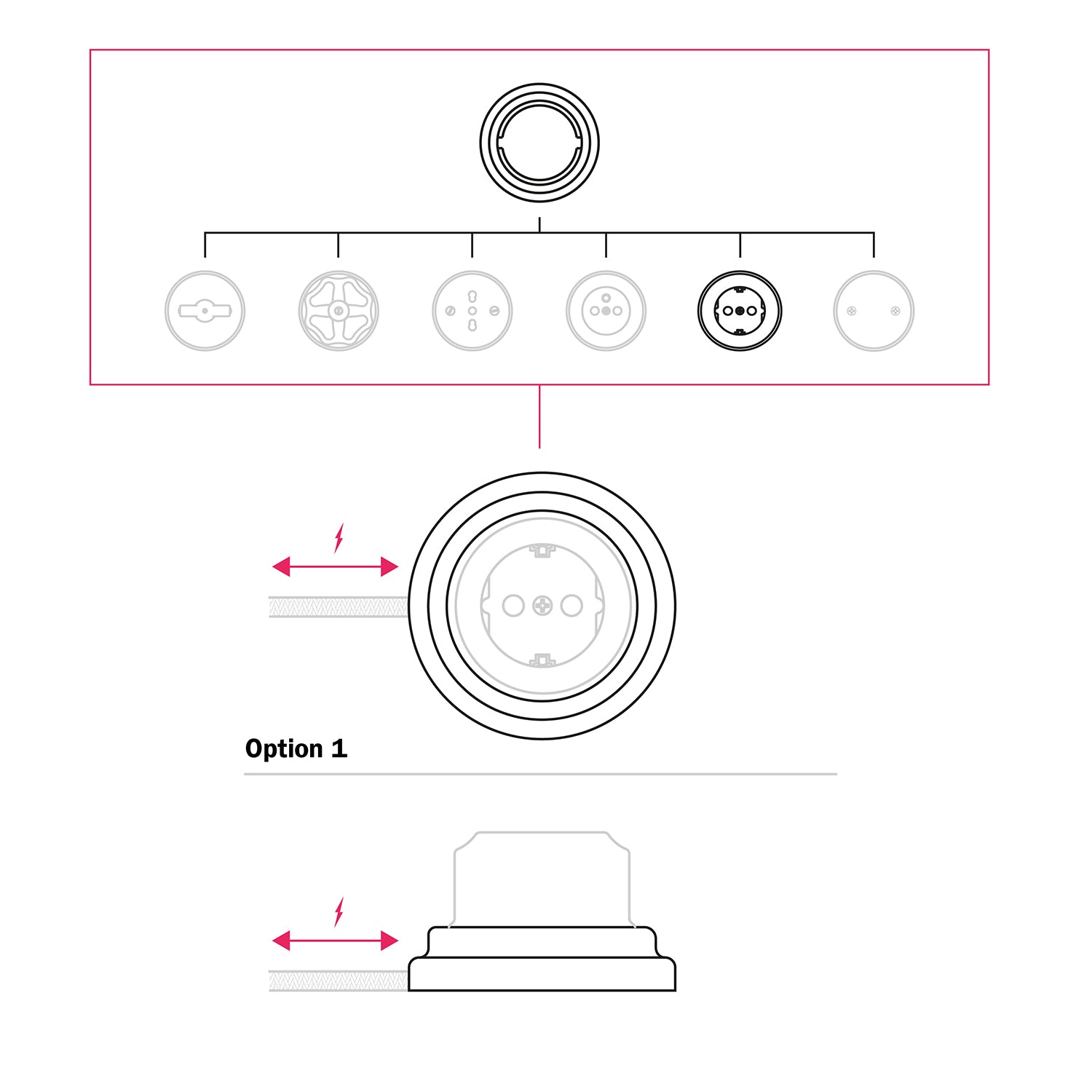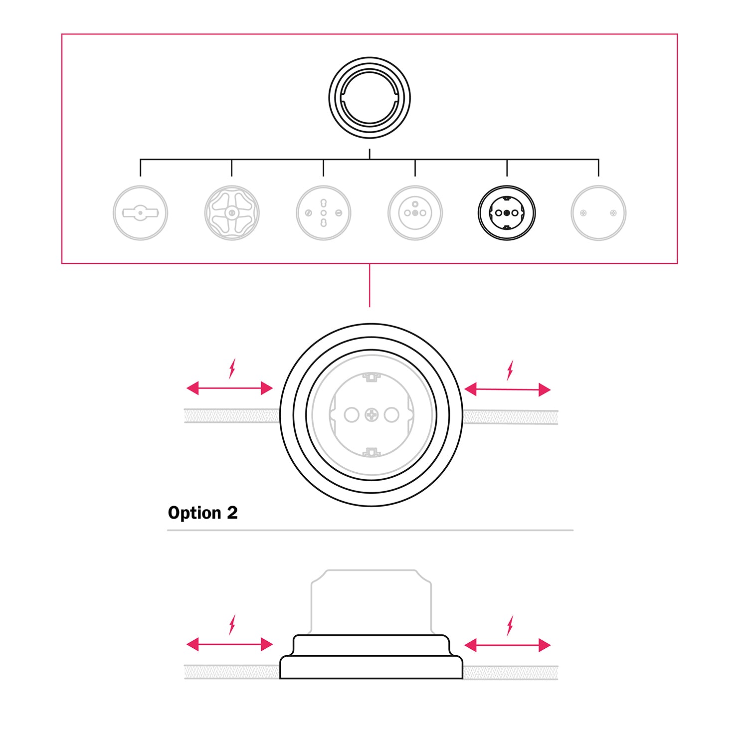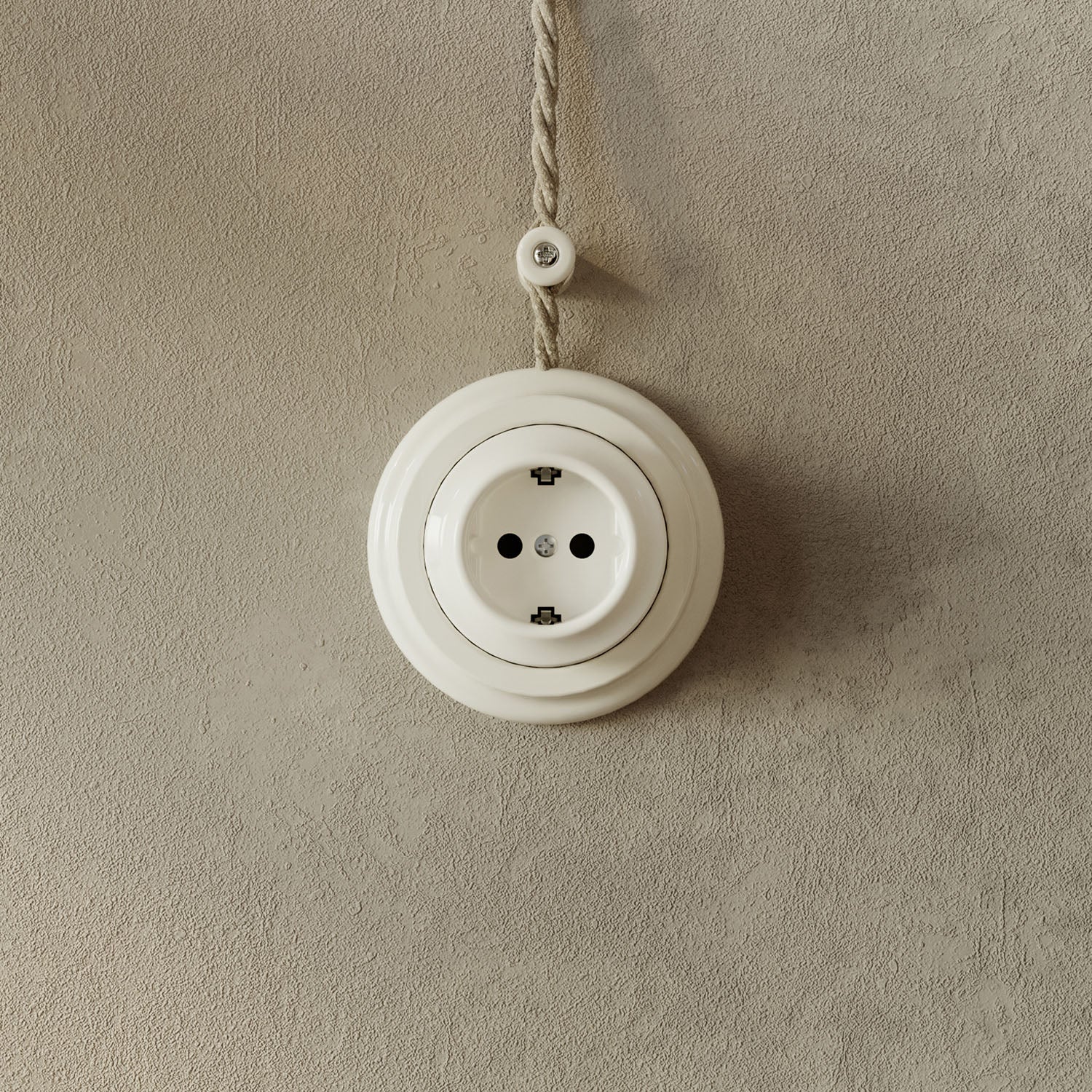 Tento set obsahuje porcelánovú zásuvku Schuko v bielej farbe a základňu, ideálne riešenie pre tých, ktorí chcú priznanú elektroinštaláciu s vintage vzhľadom a modernou bezpečnosťou. Základňa je navrhnutá na uloženie aj elektrických káblov s väčším prierezom a je vybavená vstupom/výstupom, čo umožňuje jednoducho a presne pripojiť viac svetelných bodov alebo ďalšie produkty z rovnakej série.