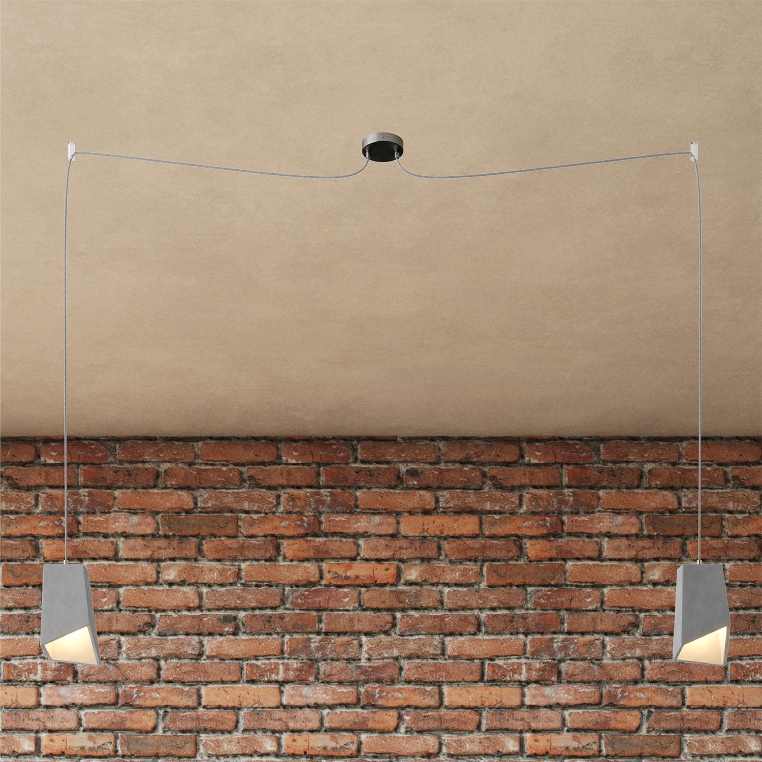 Viacnásobné závesné svietidlo pozostávajúce z: Stropná rozeta valcovitá z kovu s 2 otvormi: Priemer 120 mm Priemer otvorov 10 mm Tienidlo z betónu podľa zvolenej verzie: Prizma: ø 130 mm, V 250 mm Lievik: ø 200 mm V 260 mm Kocka: ø 150 mm V 220 mm 2 objímky E27 dvojitý závit z bakelitu pre tienidlo Držiaky na upevnenie na stenu 2 kusy kábla 2x0,75 certifikované IMQ-HAR. Dĺžka jednotlivých závesov: 220 cm Kombinácia tienidlo/kábel: ERC37/Lievik; RM19/Kocka; ERD22/Prizma; Certifikované CE.
