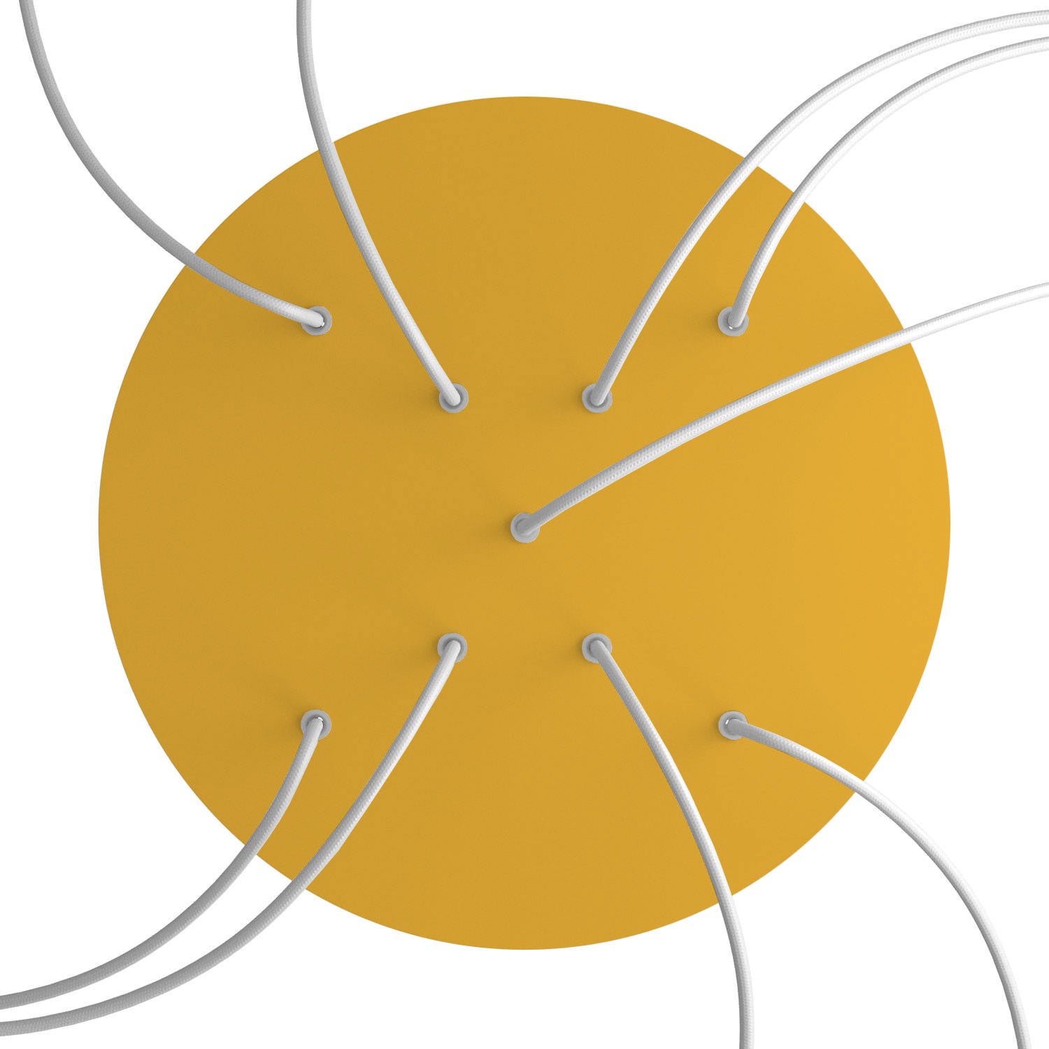 Kompletný systém Rose-One okrúhly v horčicovej povrchovej úprave, živej a retro, má priemer 400 mm s 9 otvormi v tvare X a obsahuje všetko potrebné na zostavenie tvojej stropnej rozety! Vyber si tvar, grafiku, veľkosť a počet otvorov, ktoré najlepšie vyhovujú tvojmu interiéru.