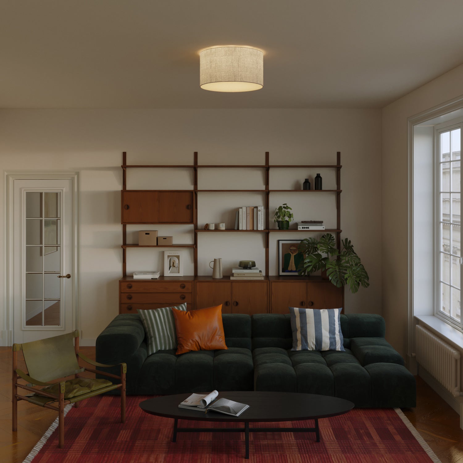Stropné svietidlo Medium z textilu v svetlej jute je ideálne pre tých, ktorí uprednostňujú prírodné materiály a svetlé odtiene. Svetlá, svieža a jemná farba sa ľahko začlení do minimalistických alebo rustikálnych priestorov a dodá im teplo a ľahkosť. Navrhnuté na montáž na strop, spája funkčnosť a prírodnú estetiku.