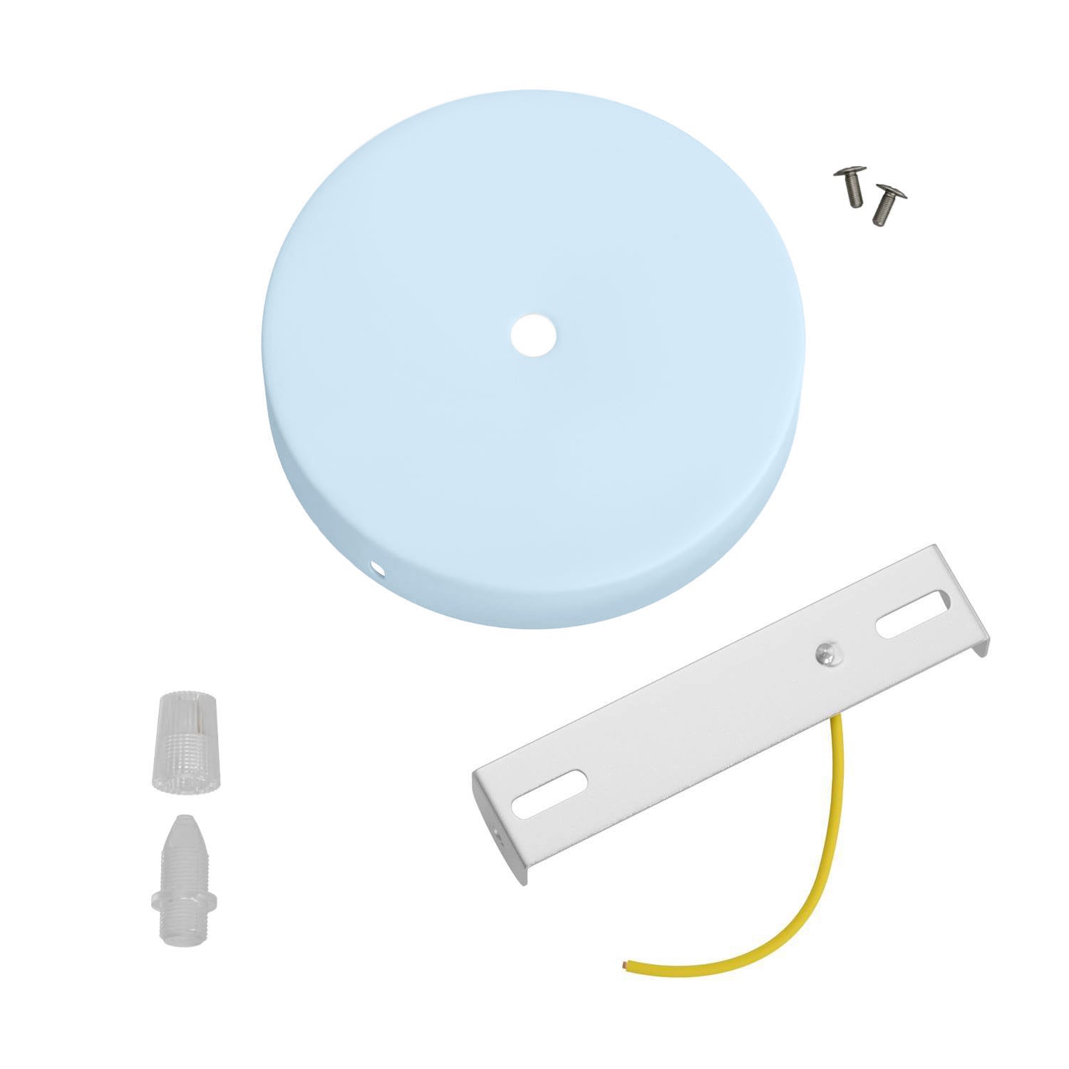 Súprava stropnej rozety z kovu s 1 otvorom v odtieni modrej cukrovej vaty je určená pre tých, ktorí chcú jemné, ale výrazné jednoduché závesné svietidlo. Svetlomodrá a zamatová povrchová úprava dodáva elegantný a upokojujúci nádych, ideálny pre interiéry v škandinávskom štýle, shabby chic alebo moderné priestory hrajúce sa s jemnými a harmonickými tónmi.