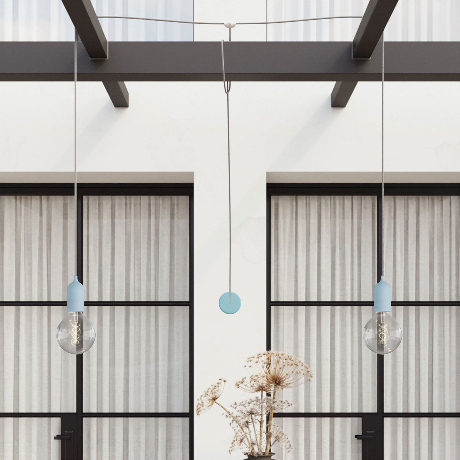 T-Snake Blu Carta da Zucchero, so žiarovkami na očiach, je zložená zo stropnej rozety, objímky a spojky systému Modulair od EIVA: komponenty s certifikáciou IP65, navrhnuté na odolnosť voči dažďu a vlhkosti, v kombinácii s neoprénovým káblom potiahnutým textilom. Dva bočné závesy umožňujú všestranné osvetlenie s čerstvou a modernou estetikou, ktorá sa hodí do každého vonkajšieho prostredia.